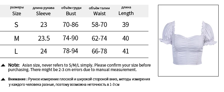90S Cropped Shirts Ruched Square Collar Backless Ruffles Short Puff Sleeve   ★Size mearsured by ourselves,sometimes has some errors, but always within 3cm.” – “: refers to the elastic range of the clothes. Note: 1 inch = 2.54 cm, 1 cm = 0.39 inch OC429
