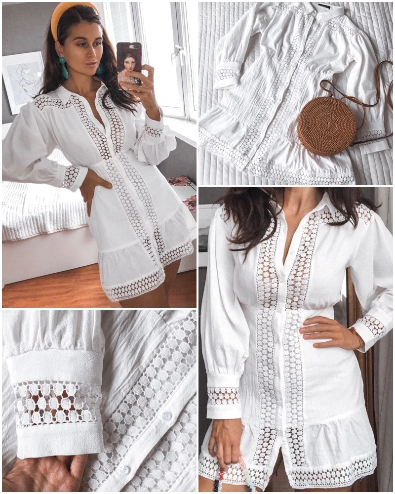 The parcel came in 1.5 months, tracked. The quality is cool, 100% cotton, thick enough fabric, not translucent, there is a lining. Behind the belt there is an elastic band. The seams are neat, without defects. Looks very cute. I'm 42 sizes: my parameters are 86-66-90 and height is 164 cm. The village is excellent (see the photo). S marking. shoulder 44 cm, half chest 44-50 cm, half waist 32 cm, stretched 38 cm, length 80 cm, from shoulder to waist 33 cm, from waist to bottom 47 cm, sleeve from shoulder 55 cm, sleeve from armpit 48 cm. Looks airy.