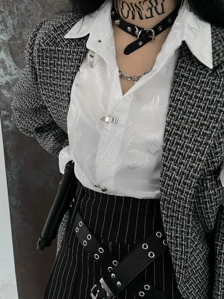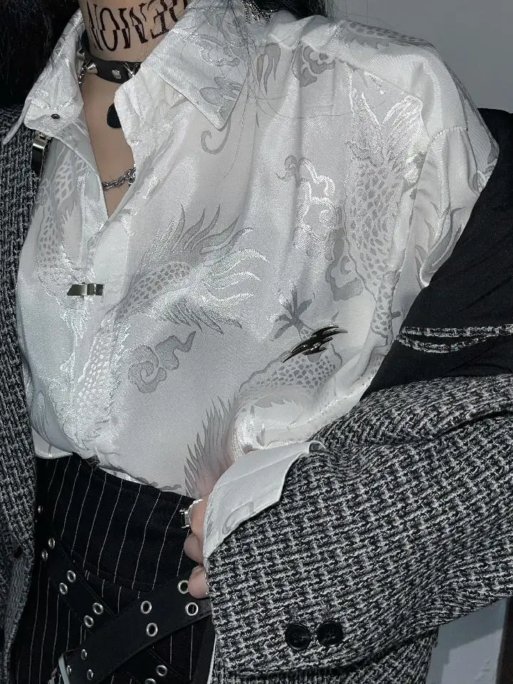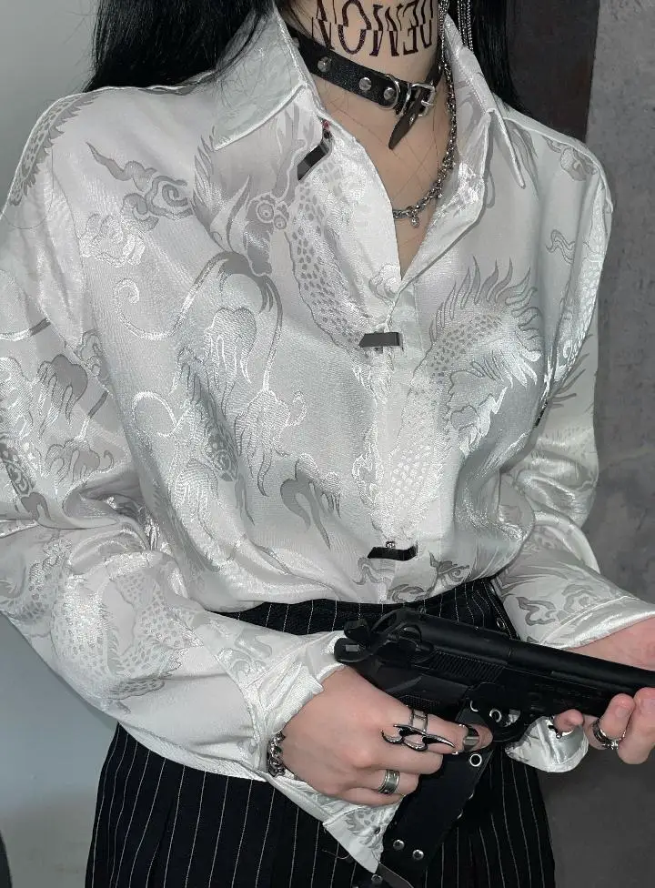 FREE SHIPPING Vintage Harajuku Silk Blouses Dragon Print Oversize Streetwear Button Up Long Sleeve Shirts Chinese Style OC0505
