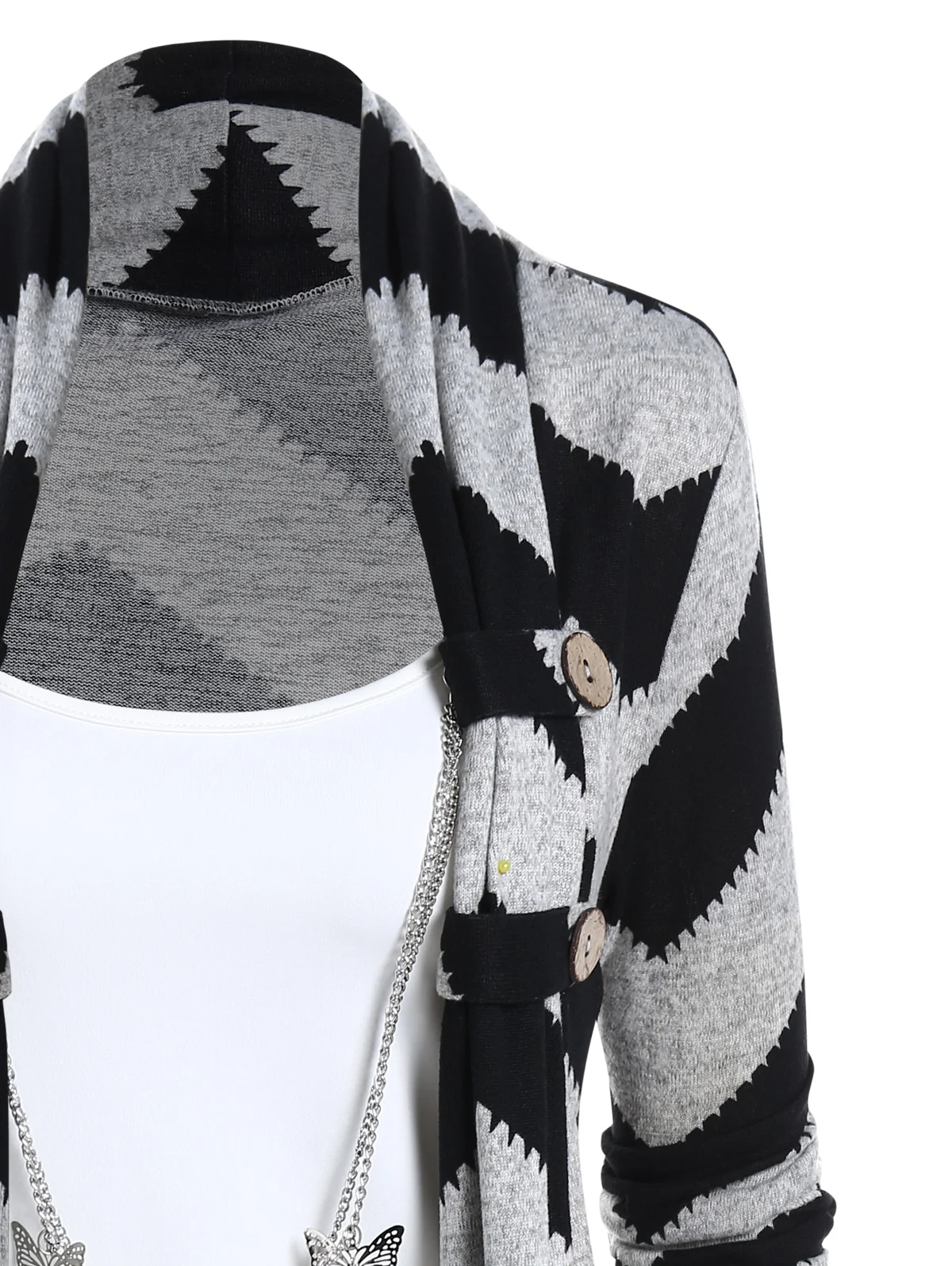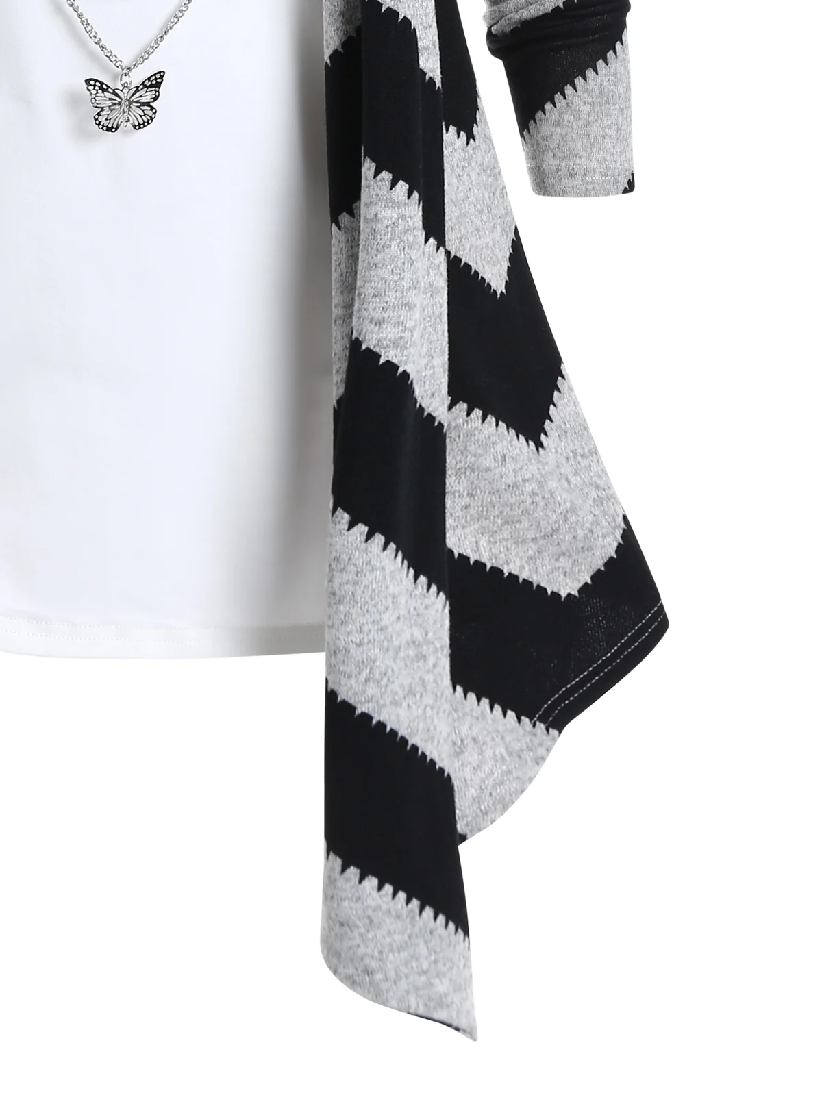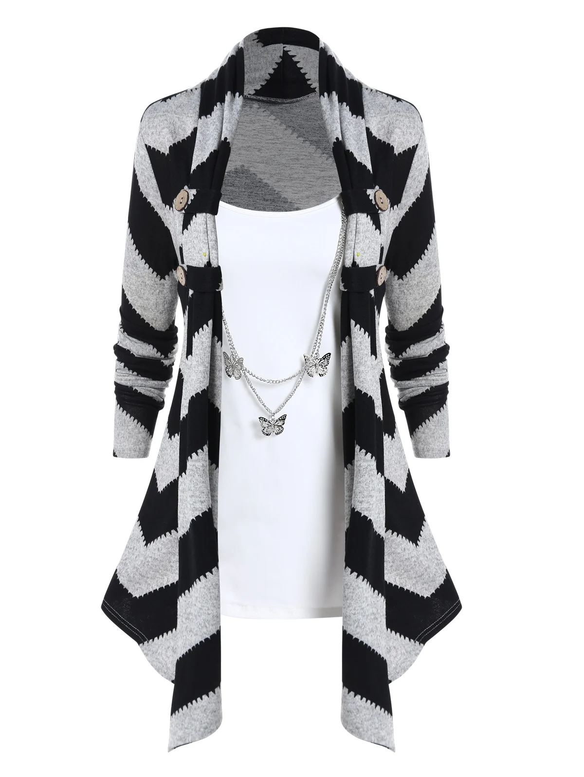 Women Chevron Graphic Faux Twinset Knit Pullovers Mock Button Colorblock Long Sleeve Asymmetric Knitted Top With Butterfly Chain OC0544