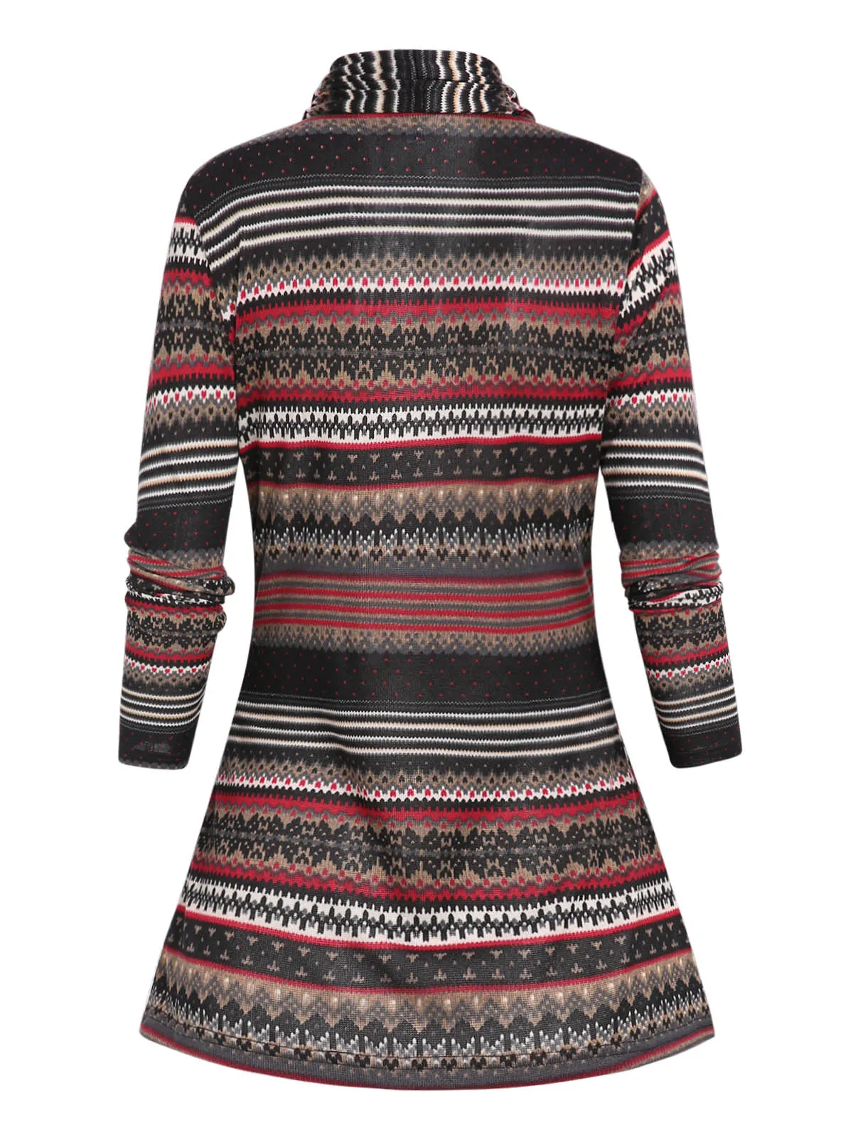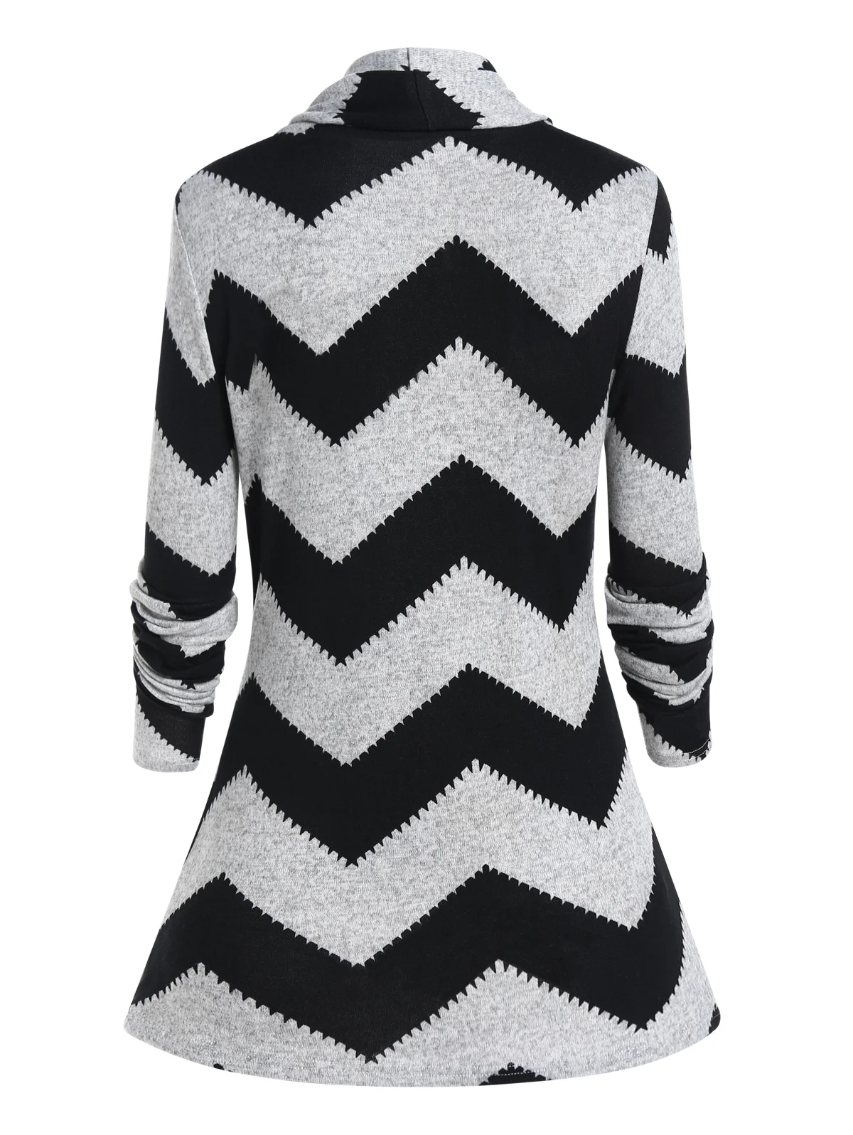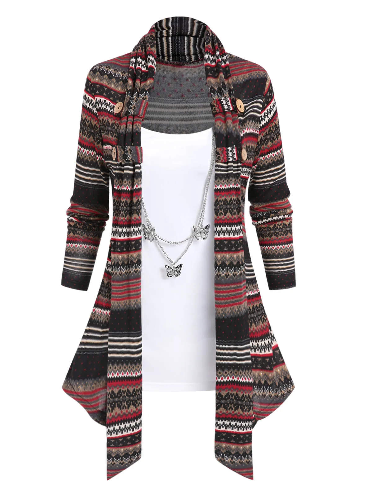 Women Chevron Graphic Faux Twinset Knit Pullovers Mock Button Colorblock Long Sleeve Asymmetric Knitted Top With Butterfly Chain OC0544